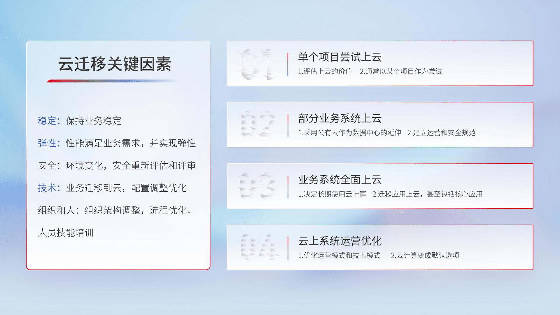 结合实际业务,,从规划设计、、云平台选型、、、云原生改造、、、数据迁移、、、集成交付,,迁移全过程为客户识别最佳上云路径,,,,做好风险识别管理,,,设计网络架构、、、、身份权限、、、、安全审计合规、、操作审计、、日志审计、、、监控告警策略、、、多站点容灾设计等,,对云上基础设施进行整体规划,,,,提升IT治理水平,,以满足弹性、、、、高可用、、、高性能的需求。。。。